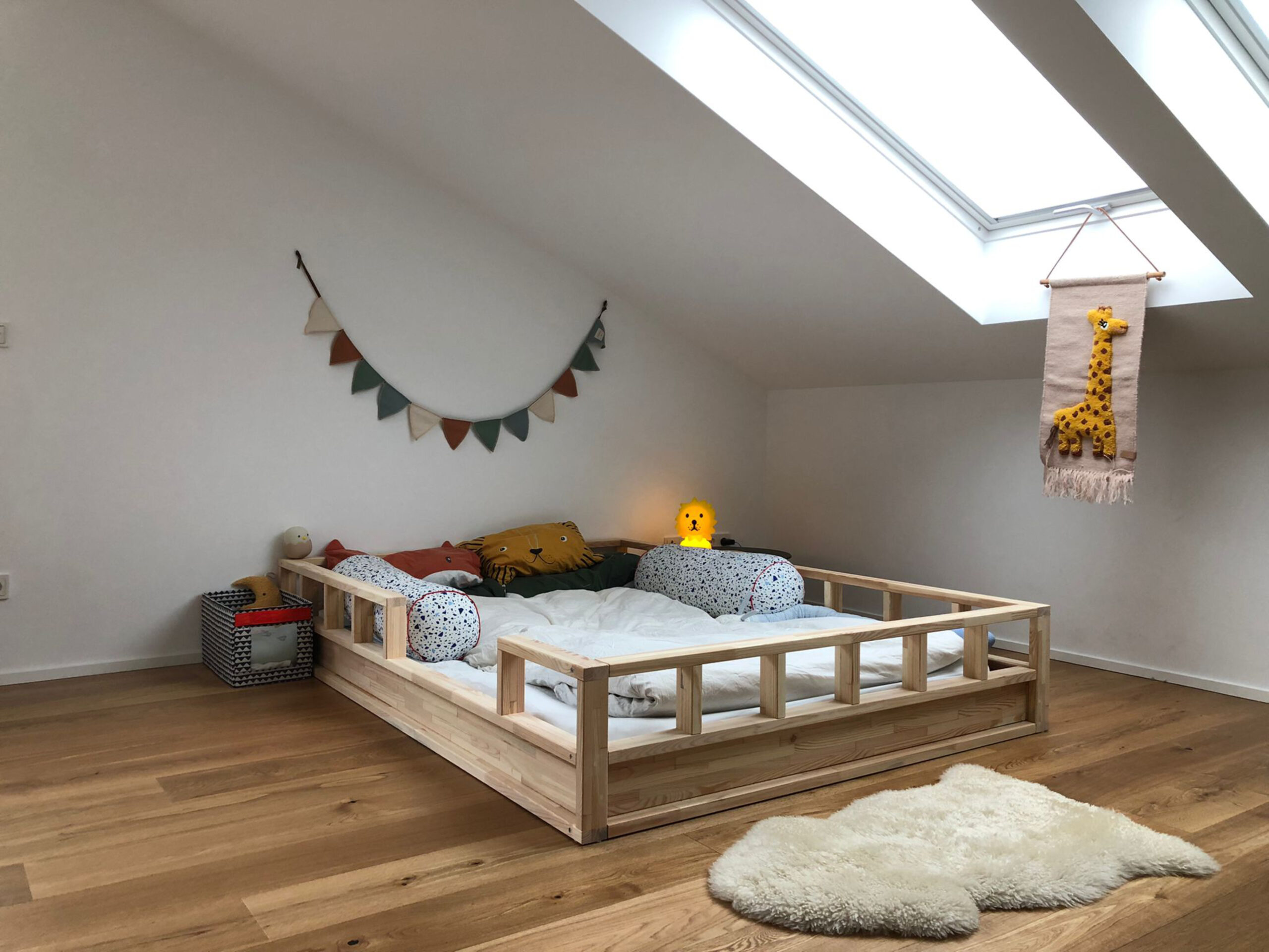 Mit einer Liegefläche von 100×200 cm bietet das Bodenbett ausreichend Platz für Eltern, die ihre Kinder beim Einschlafen begleiten möchten. Die bodennahe, stabile Bauweise ermöglicht entspanntes Co-Sleeping – ein Ort für Geborgenheit, Nähe und wertvolle Familienmomente. Entdecke auch unser Familienbett „BERN“ – perfekt abgestimmt auf dieses Design für ein harmonisches Gesamtbild in deinem Zuhause.
