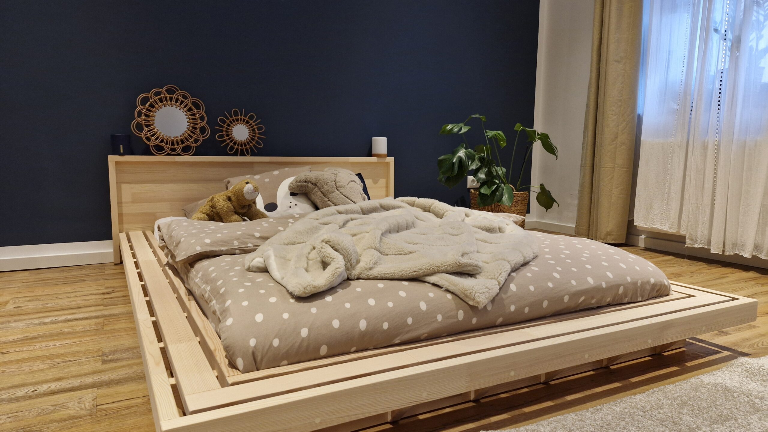 Die bodennahe Konstruktion macht das Bodenbett 180 x 200 zur idealen Wahl – besonders für Kinder, nach dem Montessori-Prinzip, oder für Co-Sleeper. Der niedrige Rahmen ermöglicht sicheres Ein- und Aussteigen sowie ein beruhigendes Schlafgefühl. Die Rahmenbreite von ca. 15 cm unterstreicht das minimalistische Design, während dezente Spalten zwischen den Rahmen für optische Leichtigkeit sorgen.