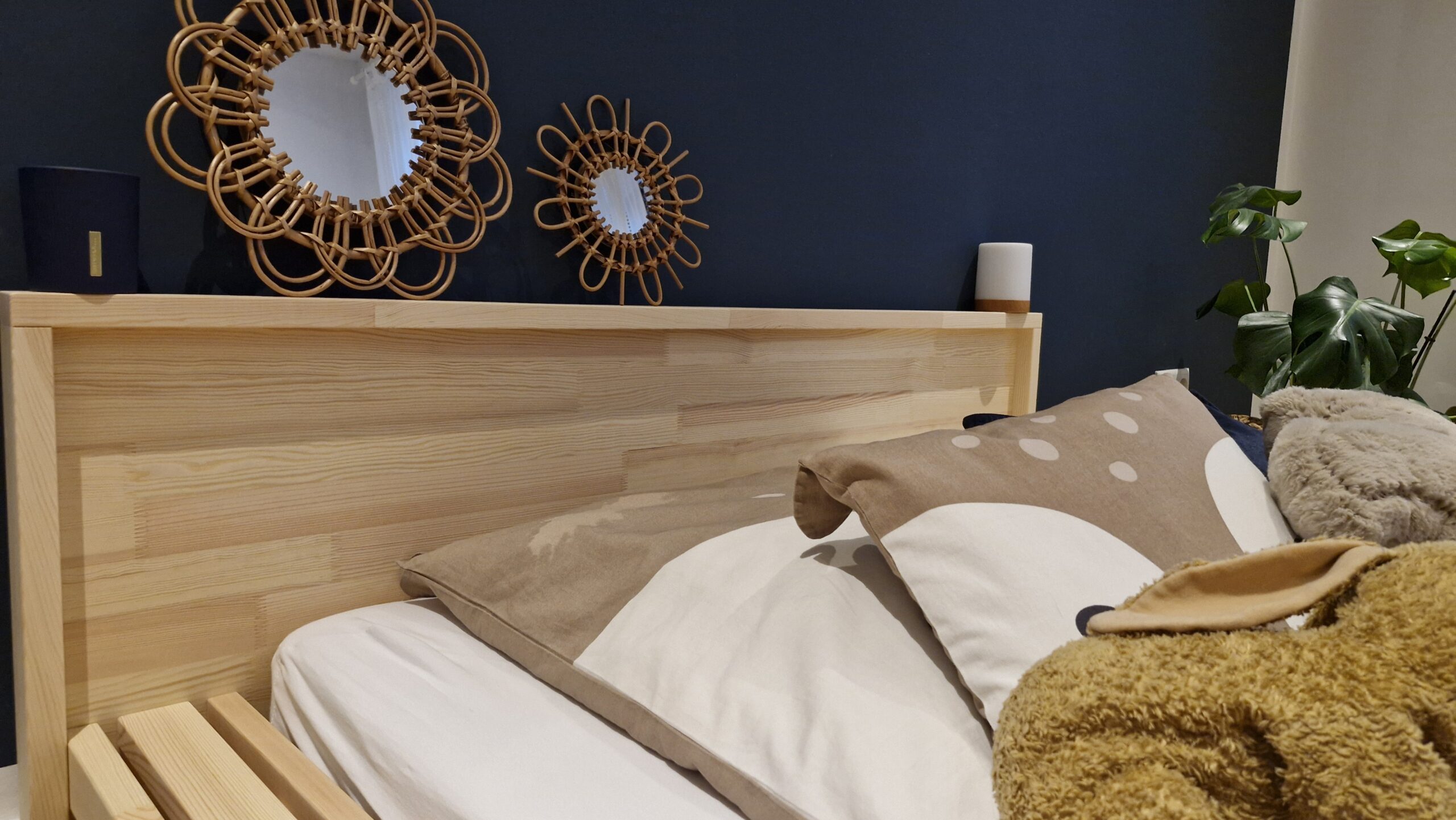 Das klare Kopfteil besteht aus 3 cm starkem Massivholz und ist von einem 6 cm breiten Rahmen eingefasst. Es dient als stabile Rückenlehne sowie praktische Ablage für Bücher, Nachtlichter oder Kuscheltiere. Je nach Perspektive wirkt das Bett wie ein schwebendes Designobjekt – schlicht, stilvoll und modern zugleich.