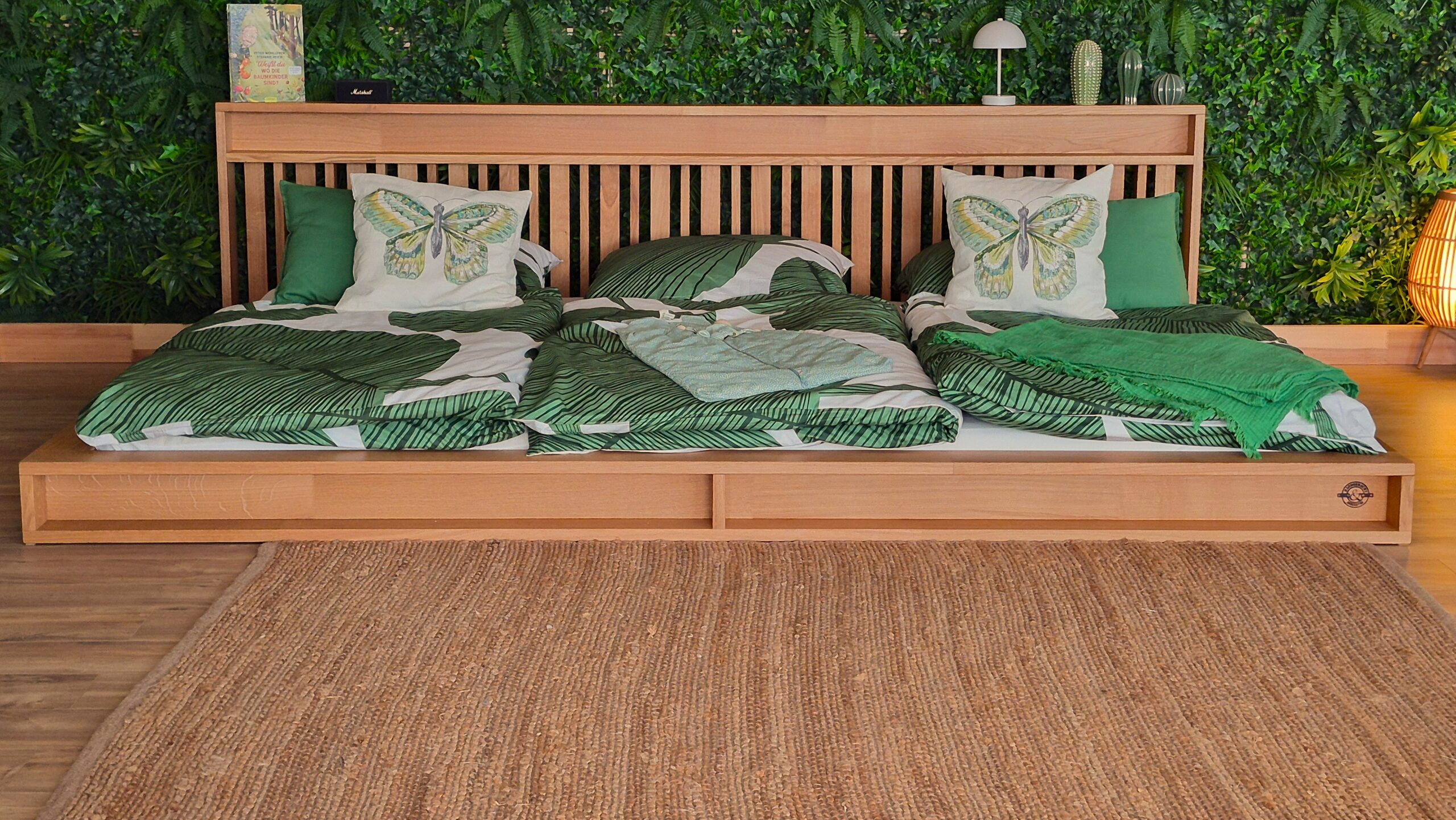 Eigenentwickelte, designgeschützte Massivholzbetten.
