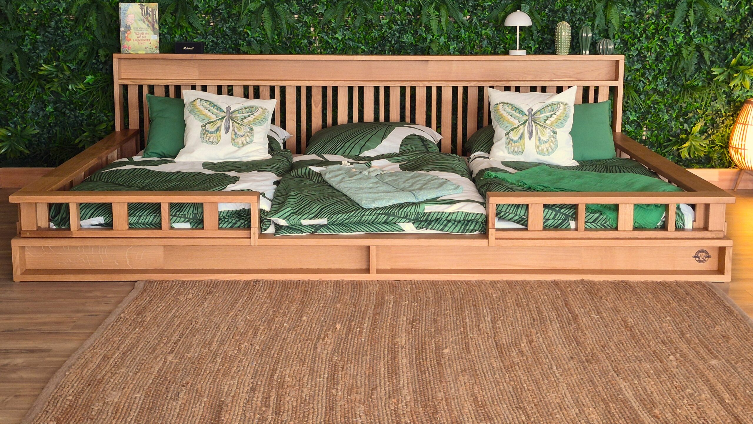 Unsere Massivholzbauweise ist auf Langlebigkeit ausgelegt. Trennstellen würden Stabilität und Optik beeinträchtigen. Dafür ist das Familienbett in jeder Größe und durch den abnehmbarem Rausfallschutz absolut solide und langlebig.