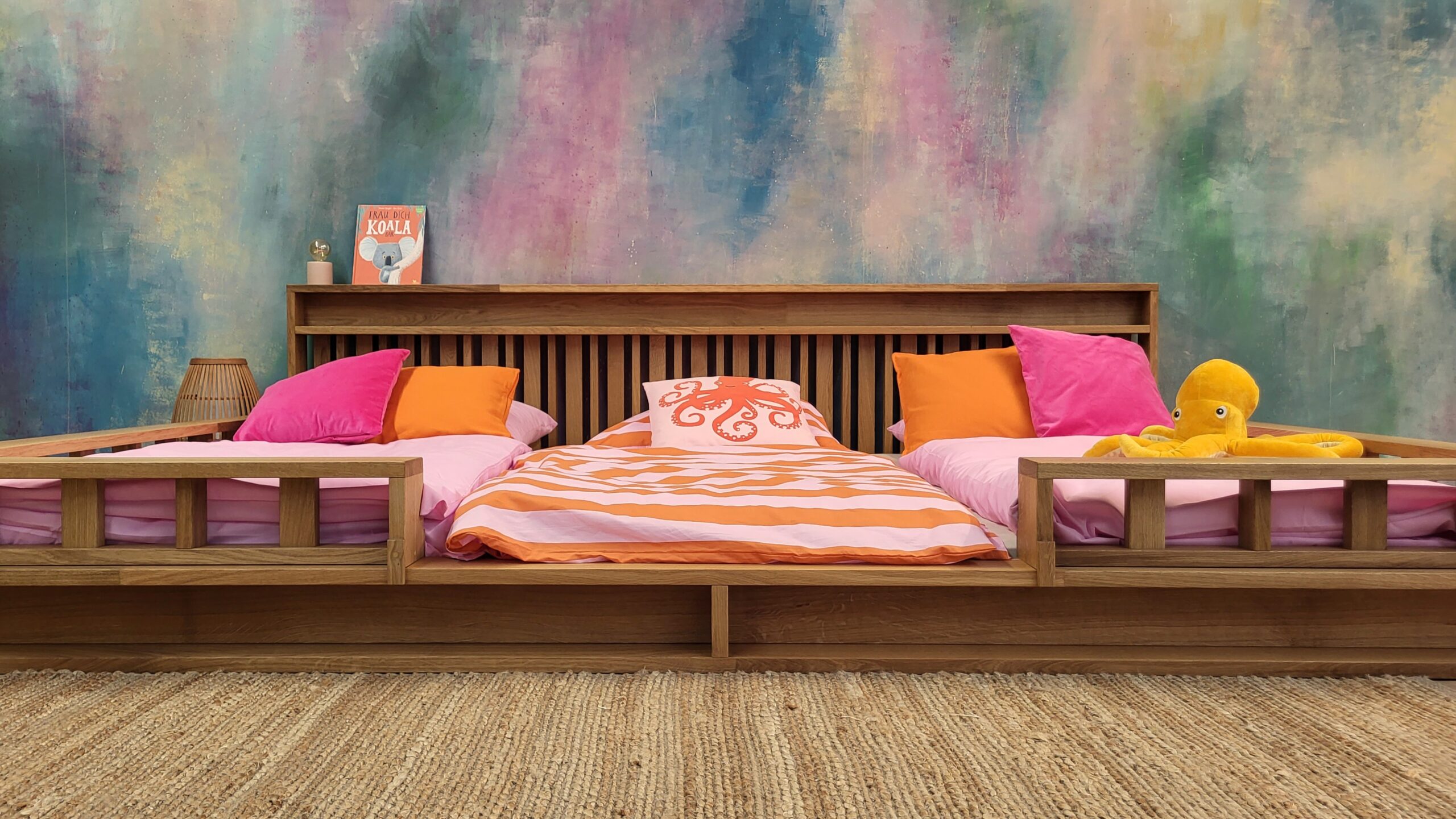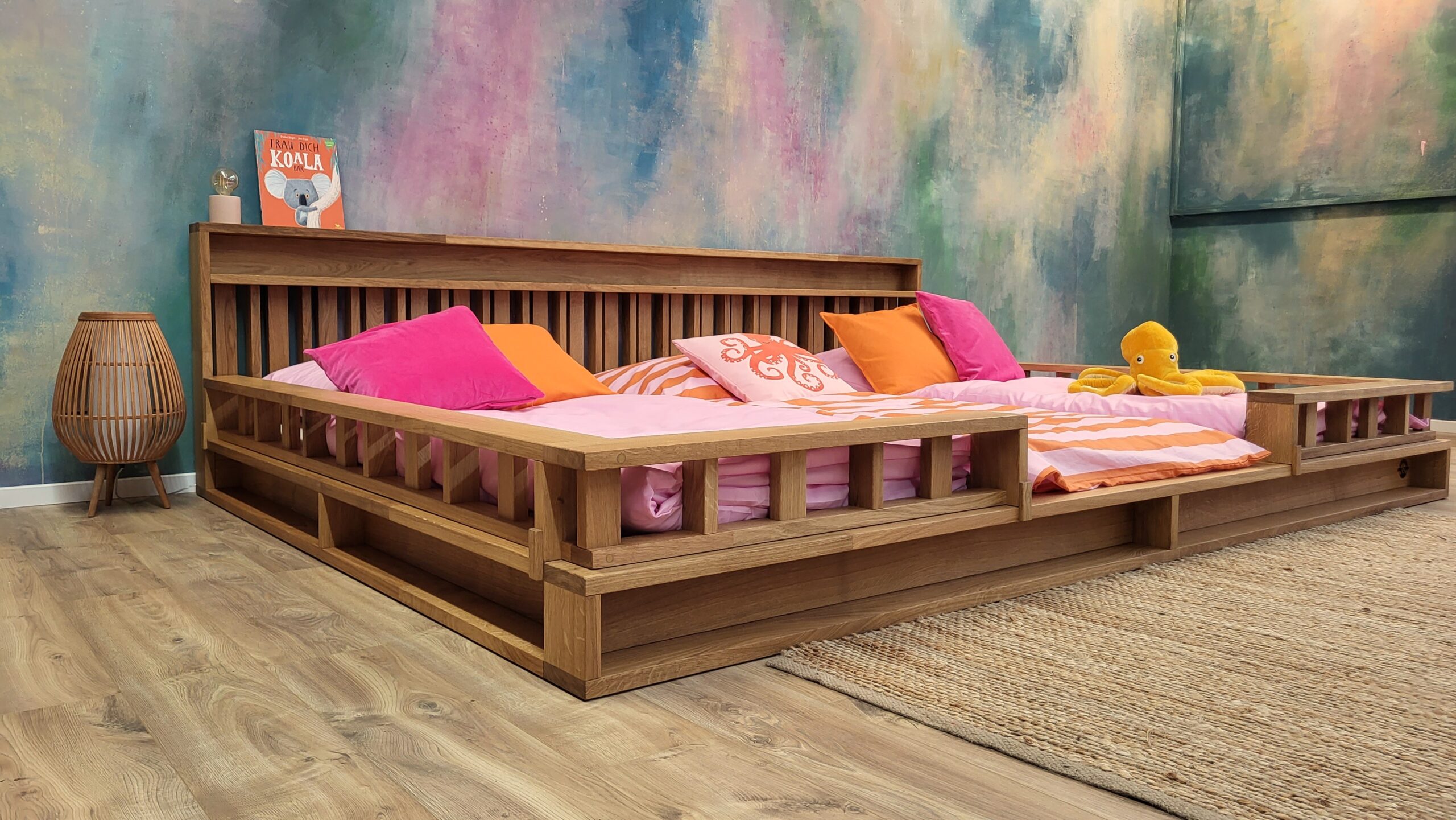 Kindgerechtes Familienbett 270 x 200 – sicher durch bodennahe Bauweise & Rausfallschutz