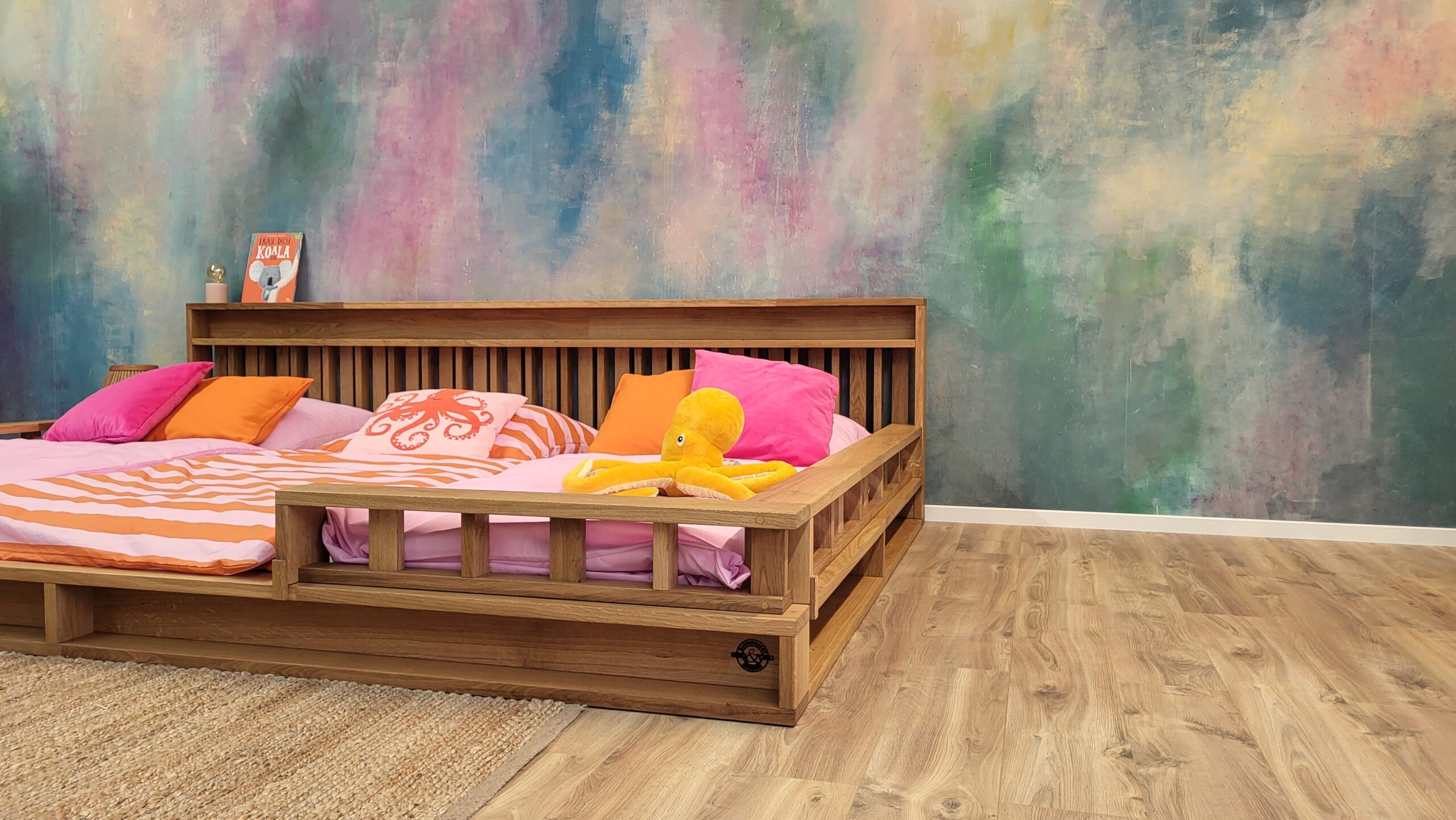 Das bodentiefe Design des Familienbett 270 x 200 ermöglicht selbst kleinen Kindern einen sicheren Ein- und Ausstieg – ganz im Sinne des Montessori-Konzepts. Der abnehmbare Rausfallschutz schützt zuverlässig vor dem Herausrollen im Schlaf und lässt sich ohne Werkzeug einfach und stabil aufstecken. Dank der cleveren Konstruktion sitzt er fest und wackelfrei.
